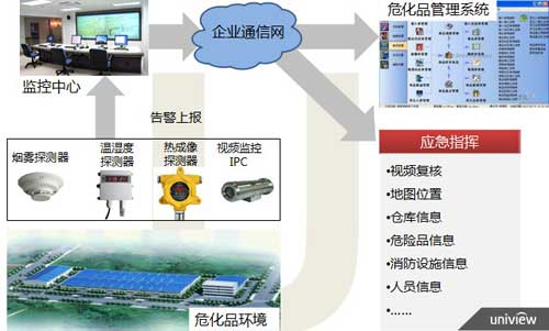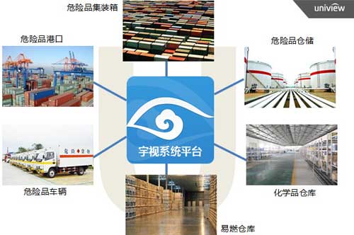 宇视可视化智慧安监方案基于开放的IMOS平台,通过接入相关的智能环境探测器,报警联动视频,并将环境信息、视频监控融合到企业安全生产应用系统和危险品监管中,可以应用在危化品的生产、运输、仓储、销售等各个环节。