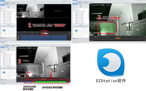 海量数据,智能检索EZStation实现从海量数据中快速提取有效数据,提高检索效率。使用方式:用户选定检索区域后,系统对选区内的录像进行智能分析,判断检索区域是否存在物体运动,同时用不同的颜色区块标识出来,快速检索。另外,用户如需查看特定时段录像,也可进行选定设置,非检索录像会以16倍数的快进速度进行回放;符合检索条件的录像则会以正常倍数进行播放。